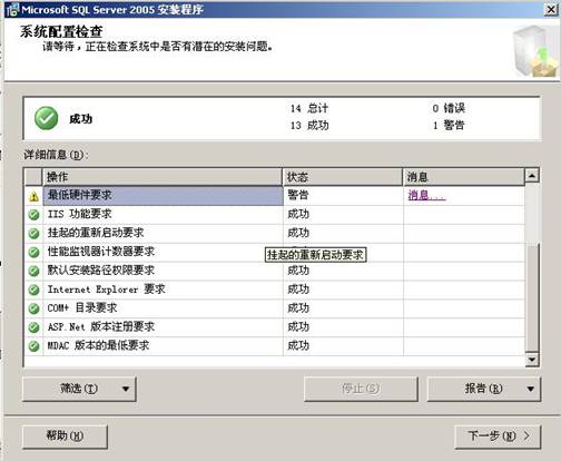 3. 點擊【下一步】,系統開始對系統配置進行檢測,(正常情況有1個警告或者沒有警告,根據電腦配置而定,這個不影響)。
