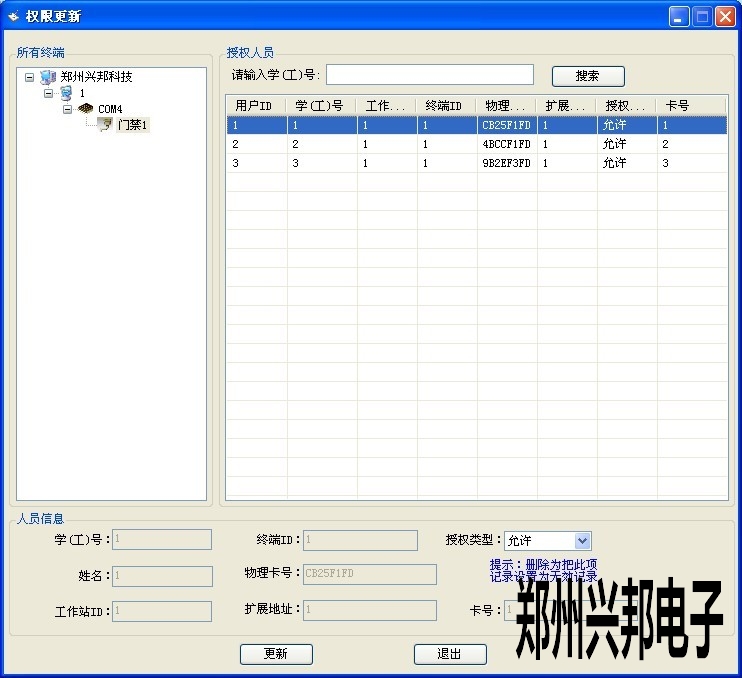 1.選擇終端,在右列表框中可顯示出該終端下的所有授權人員的名單。或者在請輸入學(工)號右邊的文本框中錄入所要更改權限的學工號,單擊搜索按鈕可在列表中查詢出該人員的授權信息。