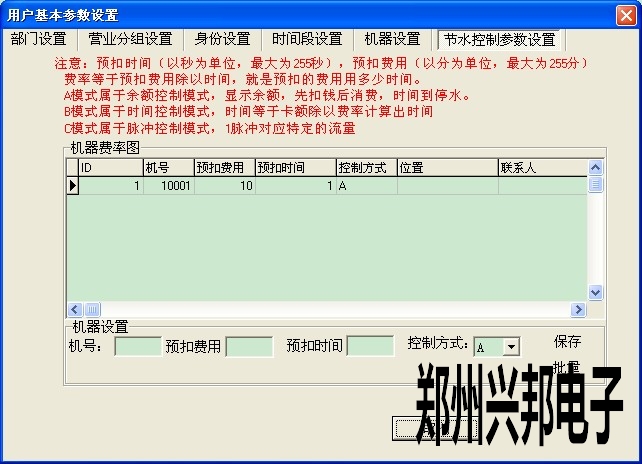 雙擊要修改水控費率的機器號,在機器設置中會出現機器的基本信息。輸入預扣費用及預扣時間,選擇控制方式后單擊【保存】按鈕即可。每更改一次費率都要下載一下水控機基本參數。