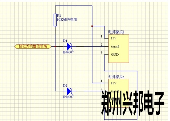 將每個二極管(IN4007)的負(fù)極和對應(yīng)的探頭信號端相連之后,再將每個二極管(IN4007)的正極擰到一起再與紅外溝槽的信號端相連。