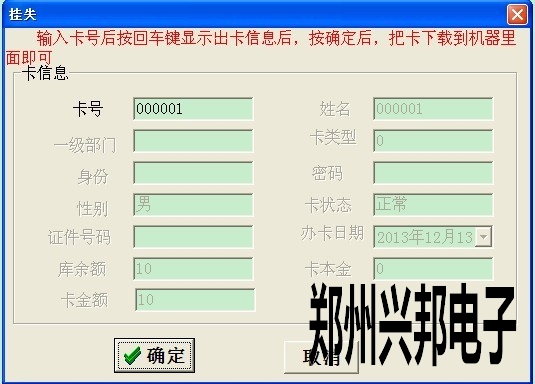 2. 此卡掛失后,然后點卡管理--補辦新卡,打開此對話框后輸入卡號后按回車鍵,當出現卡信息時,把新卡放到讀卡器上點讀卡,然后點寫卡即可,如下圖所示