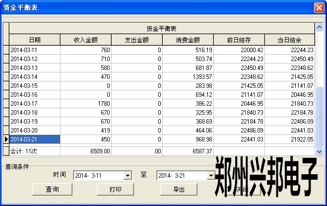 485軟件中資金平衡表是查詢指定日期的賬目情況,包括收入、支出、消費和結余,統計時是按天統計的,顯示時也是按天顯示,一天一行,每一天都一個結存,當日結余=收入金額-支出金額-消費金額+前日結存,收入是指出納員每天的存款、收取的卡本金等,支出是指取款、退還卡本金、收繳舊卡的退款等,消費金額是指每天的消費總額,前日結存是指前一天的結余,每天的賬都是互相關聯的,若有一天的賬目不對,會影響到以后的所有賬目,所以在結賬前要求必須將所有消費數據都采集完畢。