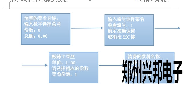自動模式:輸入菜肴編號,點擊確認后選擇份數,點擊確任后出現消費的菜肴名稱、份數、總額,將卡片放于刷卡區,即可進行扣費,扣費后顯示扣費金額、手續費用、卡上余額、卡號,操作流程如下圖所示: