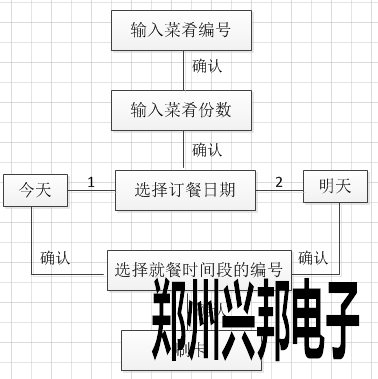 簡易模式下訂餐操作方法:輸入菜肴編號,點擊[確認]后輸入菜肴份數,點擊[確認]后選擇訂餐日期(今天或者明天),點擊[確認]后選擇訂餐的時間段(共有12個時間段),輸入時間段編號點擊[確認]后,顯示訂餐的菜肴名稱、份數和總額,將卡放到刷卡區,聽到滴的一聲響后即可訂餐成功,操作流程如下圖所示: