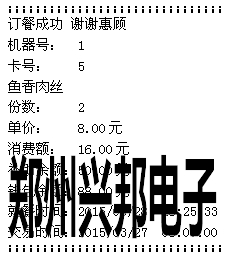 計算模式下按‘+’號鍵可進行取餐,取餐時將需要取餐的卡放到刷卡區,消費機可自動讀取卡片上的訂餐信息,并將其顯示出來,按‘+’號鍵可翻頁查看訂餐信息,按‘確認’可進行取餐,取餐成功后會顯示就餐成功、菜肴名稱、份數、扣費金額,若連接的有打印機,可打印取餐信息,打印的格式如下圖所示: