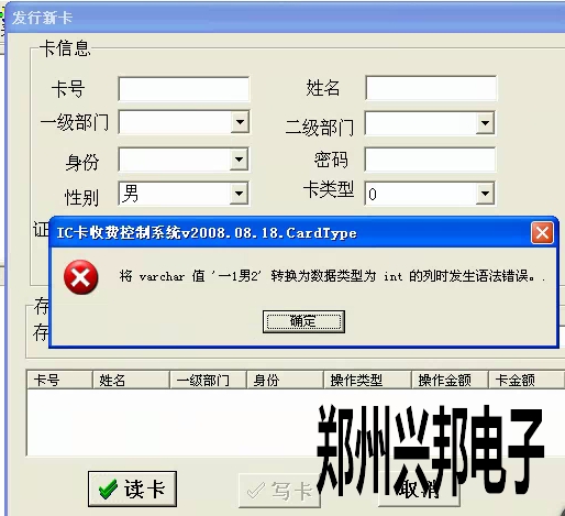 客戶使用的是我們的局域網一卡通食堂售飯機,在使用我們軟件時,新卡無法發行,在發行新卡的時候出現了將varchar值‘一1男2’轉換為數據類型為int的列時發生語法錯誤。