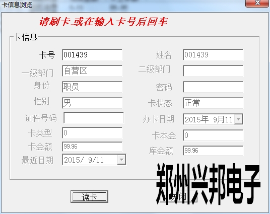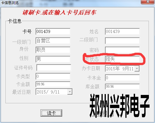 卡片就上面三種狀態,另外一些操作,會造成卡狀態改變,比如:掛失的卡解掛,就變成消費卡;掛失的卡補辦新卡,掛失卡就會變成新卡;消費卡被收繳舊卡就變成新卡。新卡在消費機上刷卡會顯示1-Err,消費卡會顯示金額,掛失卡會顯示4-Err。