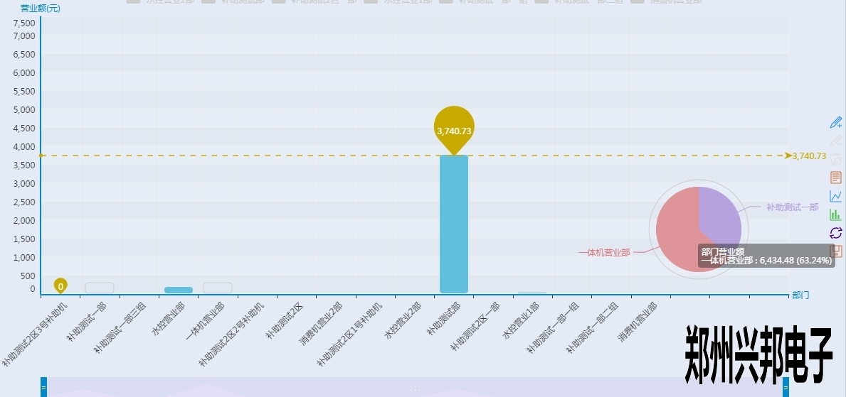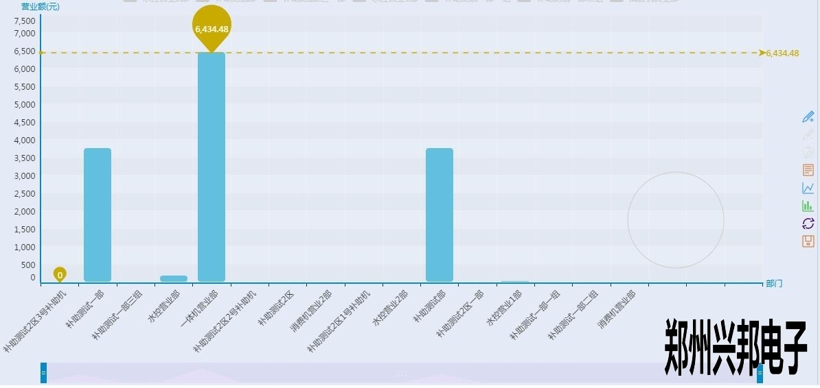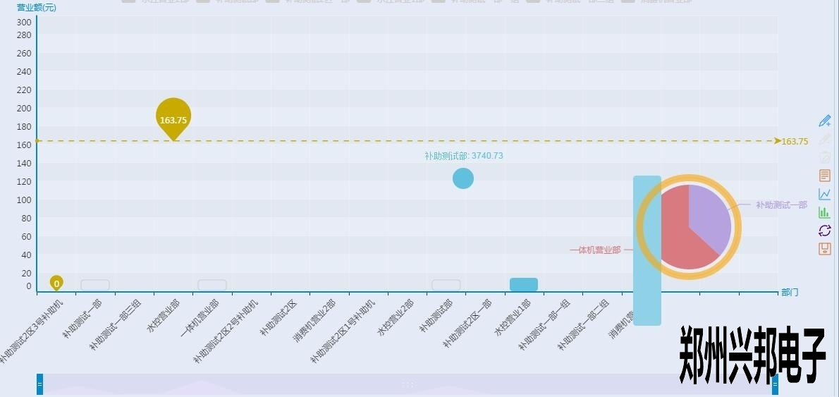 看上起跟終端營業(yè)圖表差不多,但是有沒有注意到有一根和終端營業(yè)分析圖不一樣樣色的虛線?這是這個圖表里面的最大值,也就是營業(yè)額最高的部門,當(dāng)然下面的工具條也可以像終端營業(yè)分析圖一樣的滑動來看某個具體的柱圖,不過你又沒有注意到后面還有一個圈?對那是一個圈圈,有什么用呢?來看一下下面的圖形: