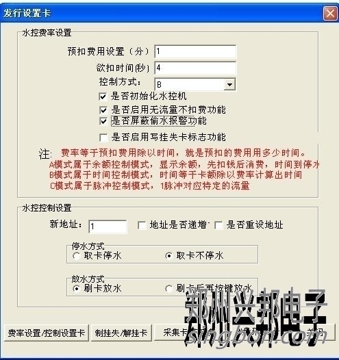 2、在水控費率設置里面,預扣費用設置寫1,預扣時間寫4,控制方式選擇B,按下圖來設。然后制一張費率設置卡。