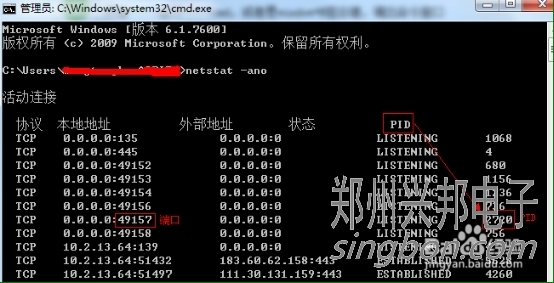 查看被占用端口對應的PID,輸入命令:netstat -aon|findstr "49157",回車,記下最后一位數字,即PID,這里是2720
